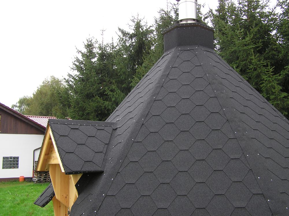 Unsere Kotas sind mit hochwertigen Dachschindeln von Icopal Oy gedeckt. Die schwarzen Dachschindeln haben ein sehr klares Schwarz, nicht so "verwaschen". Dazu ist Glassand mit in die Schindeln eingearbeitet. Der Glassand führt bei Sonnenschein zu einem gewissen Glanz des Daches - schwer vorzustellen, wenn man es nicht gesehen hat - schauen Sie bei uns vorbei und sehen Sie sich den Effekt live vor Ort an!